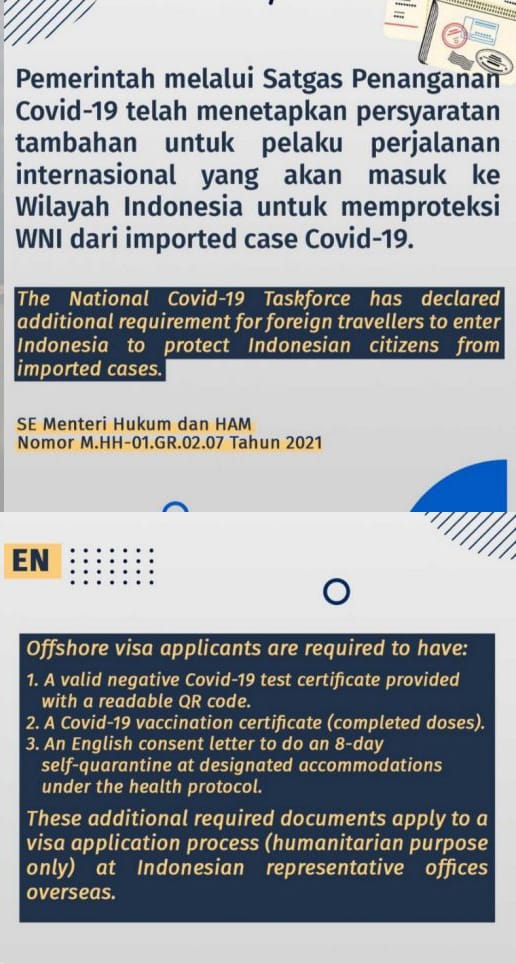 These changes are made for a number of reasons, primarily because of the spike in Covid cases in Indonesia and the need to curve the situation. Additionally, during this pandemic dodgy visa agencies have been selling visas without requesting the documentation required by Indonesian Immigration Authorities, faking documents such as Covid tests.